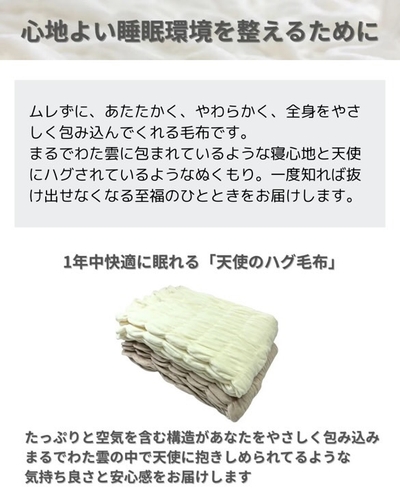 ベッドから抜け出したくなくなるような毛布を目指して。ムレずに、暖かく、やわらかく、全身をやさしく包み込んでくれる毛布です。まるで綿雲に包まれているような寝心地と天使にハグされているようなぬくもり。一度知れば抜け出せなくなる至福のひとときをお届けします。