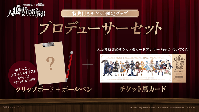 なお、前売チケットは+3,500円で特典付きチケットに変更が可能。特典付きチケット限定グッズ「プロデューサーセット」は、アイドルたちから集めた情報をメモしたり書類をまとめたりするのに便利な、描き起こしデフォルメイラストがデザインされた「クリップボード」と「ボールペン」、さらに描き下ろしイラストがデザインされた「チケット風カード」です。