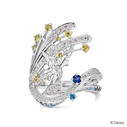 このほどの新作は、「ミッキーマウス」が夢の中で一人前の魔法使いになる象徴的なシーンをモチーフにした、プレミアムジュエリーです。夜空に魔法をかけるきらめきを、多彩な宝石とともにラグジュアリーなデザインで繊細に表現しました。