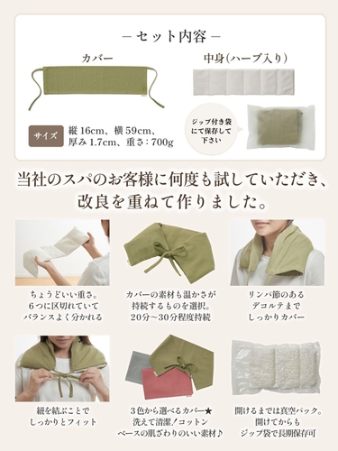 首・肩・腰・お腹など全身に使える温熱セルフケアアイテムです。