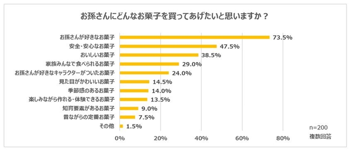 孫に買ってあげたいお菓子について尋ねたところ、最も多かった回答は「孫が好きなお菓子」(73.5%)でした。次いで「安全・安心なお菓子」(47.5%)、「おいしいお菓子」(38.5%)、「家族みんなで食べられるお菓子」(29.0%)が続き、祖父母は「孫が喜ぶかどうか」を第一に、おいしさや安心感も含めて総合的に選んでいることがうかがえます。