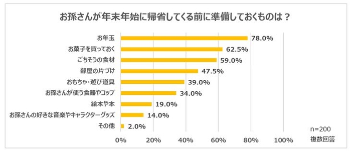 孫が年末年始に帰省してくる前に準備しておくものについて尋ねたところ、「お年玉」が78.0%、「お菓子」が62.5%、「ごちそうの食材」が59.0%でした。年末年始に祖父母がお菓子を準備して孫を迎える姿が浮かぶ結果となりました。