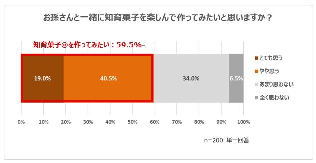 孫と一緒に知育菓子®を楽しんで作ってみたいかを尋ねたところ、「作ってみたい」と回答した人は59.5%にのぼりました。孫とお菓子を作って食べる体験が一緒に過ごす時間、会話が増えるきっかけにつながると考えられます。