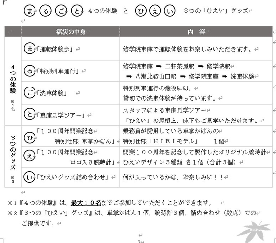 福袋の中身 観光列車「ひえい」を1日貸切できる『ま(・)る(・)ご(・)と(・)ひ(・)え(・)い(・)』の7文字に合わせた