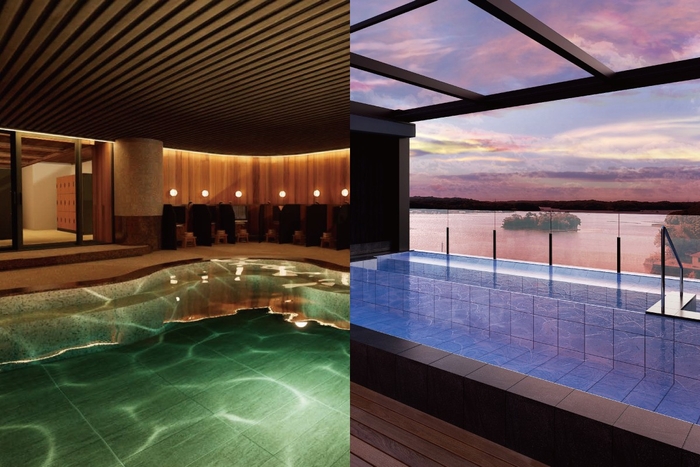 本館3階フロアに露天風呂を新設いたしました。四季折々の英虞湾の景色をご覧いただきながら入浴が楽しめます。特に夕暮れ時は「日本の夕陽百選」に選ばれた素晴らしい夕景が望める時も。既存の大浴場と露天風呂には水風呂を新たに設置。館内湯めぐりもお楽しみください。