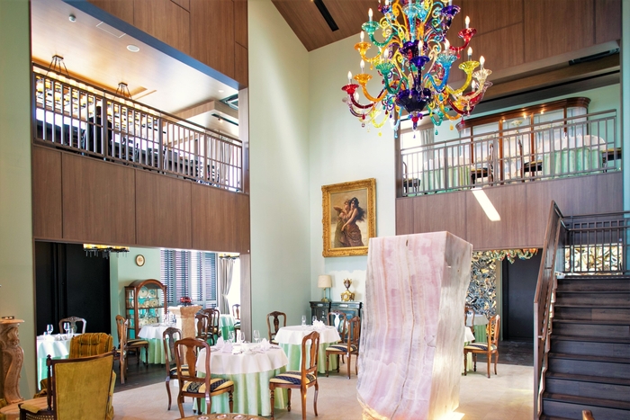 オリジナルショーと共にお愉しみいただける特別コースでは、物語が織りなす世界感を一皿ごとに表現。前菜は、生ハムとじゃがいものドフィノワ、仔鴨ロース肉のロティ、レモンコンフィチュールが奏でる調和を。魚料理は、淡路島産舌平目のポッシェに小柱と蟹のファルスを添え、海の恵みを楽しめます。メインは、淡路牛イチボのローストに芳醇なマデラソース、フォアグラのラビオリと大根のコンポートを添え、旨味が織りなすハーモニーを堪能いただけます。焼きリンゴを使用したデザートで、物語を華やかに締めくくります。