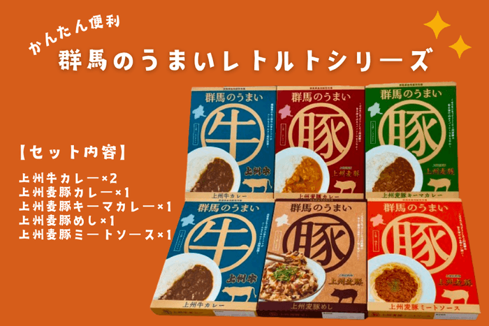 芳醇な旨みの上州牛カレー、まろやかなコクが広がる上州麦豚カレー、スパイス香る上州麦豚キーマカレー、肉の旨みを生かした上州麦豚ミートソース、ご飯がすすむ上州麦豚めし、全5種・6パックのセットです。