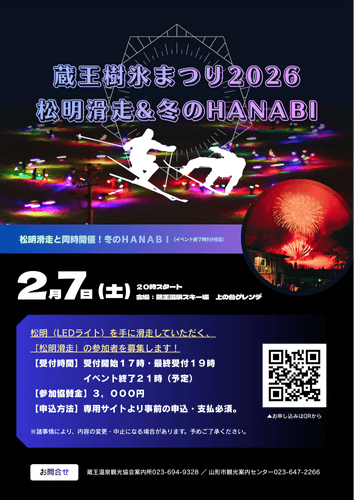 2月7日に開催される蔵王樹氷まつりのメインイベント「松明滑走&冬のHANABI」における「松明滑走」の参加者を募集します。蔵王温泉スキー場でLEDライトの松明を手に滑走し、冬の花火と共に特別な夜間イベント体験をお楽しみいただけます。