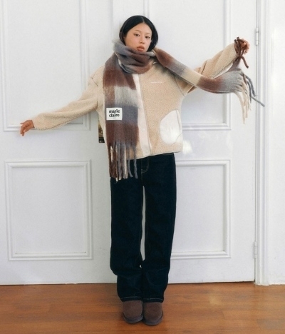 太めチェックが主役の韓国風のマフラー。ソフトな肌当たりでずっと巻いていたくなるような心地よさです。