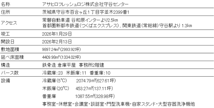 1,700台のトラックと2,700人超のドライバーで毎日500万人の食生活を支える物流インフラ企業、アサヒロジスティクス株式会社(埼玉県さいたま市大宮区/代表取締役社長 横塚 元樹)は、グループ会社であるアサヒフレッシュロジ株式会社(代表取締役社長:森 立郎)の茨城県守谷市における新たな物流拠点「守谷センター」が竣工し、2026年2月13日(金)に開所式を執り行うことをお知らせいたします。