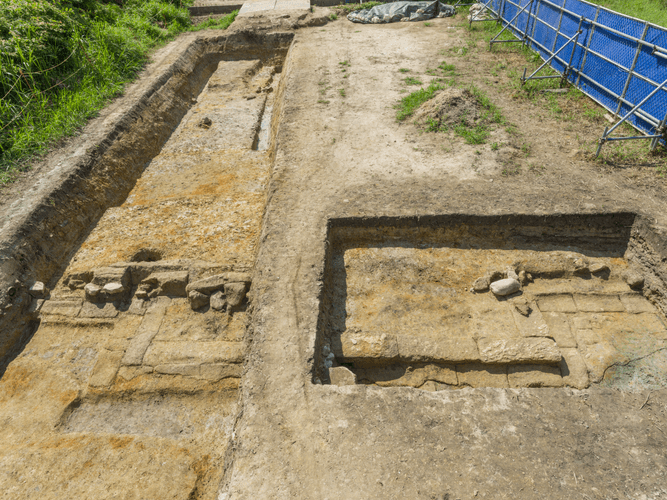 基壇建物の基壇外装をなす東西方向の凝灰岩列を南北2か所で検出し、西院において創建期に遡る東西棟の基壇建物1棟が良好な形で遺存していることを確認した。