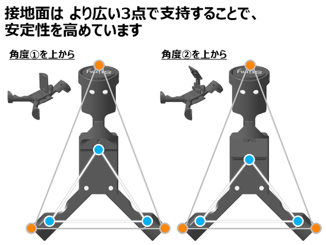 2. ダブル三点支持による安定構造:接地面とスマホ支持部にそれぞれ3点支持構造を採用。不安定な場所でも抜群の安定性を実現し、あらゆるスマートフォンに対応します。(非常に厚いケースには一部非対応)