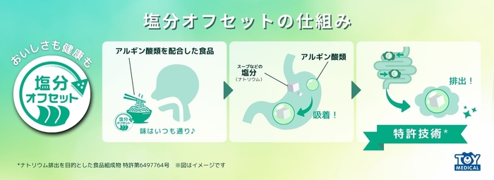 トイメディカル株式会社は、「塩分摂取量そのものを減らす」のではなく、体内への吸収をコントロールする「塩分オフセット技術」という新しい発想の技術を開発いたしました。