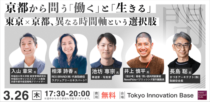 本イベントはKISとして初の東京開催となり、早稲田大学ビジネススクール教授の入山章栄氏をはじめ、各界の第一線で活躍する登壇者とともに、京都の歴史・思想を媒介とした「これからの時代の働き方・生き方」を考えます。