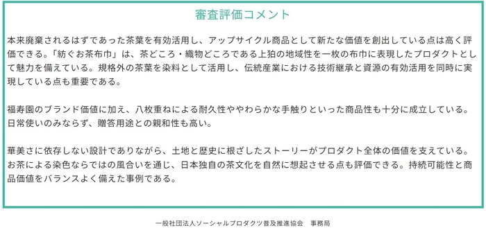 この度、株式会社福寿園(本社:京都府木津川市)の「紡ぐお茶布巾」と「日本茶ボトルドティー(福壽、香涼、京紅)」がソーシャルプロダクツとして賞をいただきました。