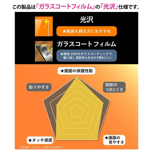 割れないPETフィルムに、アクリル系コーティングを施して表面硬度10Hを実現。ガラスのような硬さで傷に強く、しなやかさを兼ね備えたフィルムです。画面の美しさをそのまま楽しめる光沢仕様で、見た目もクリア。