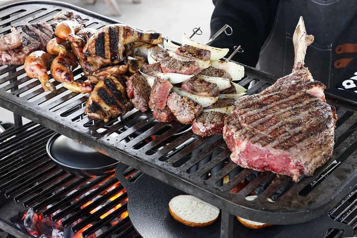 コーナーでは、南米のBBQスタイルで使われる大型グリル「パリージャグリル」を使い、スタッフが目の前で肉料理を焼き上げます。