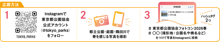 応募は簡単です。東京都公園協会の公式Instagramアカウント「@tokyo_parks」をフォローし、指定の2つのハッシュタグ(「#東京都公園協会フォトコン2026春」、「#〇〇(撮影地の公園名や橋名など)」)をつけて、都立公園・庭園、隅田川で撮影した写真をInstagramに投稿するだけです。