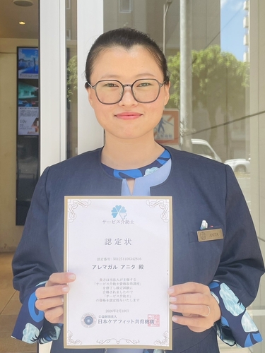 サービス介助士資格を取得したアクアチッタナハ フロントスタッフのアニタさん