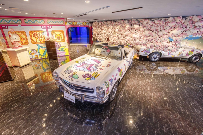 ハローキティとハローキティのボーイフレンドのダニエルが乗った車や全てにクリスタルがあしらわれた煌びやかでラグジュアリーなハローキティのフィギュアの展示など、360度どこを切り取っても写真映えする空間を演出