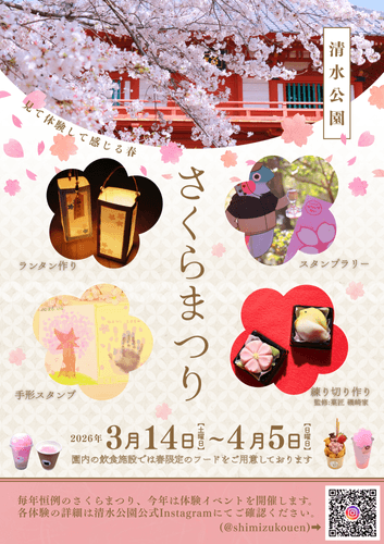清水公園では、2026年3月14日(土)から4月5日(日)までの期間、「さくらまつり」を開催中です。