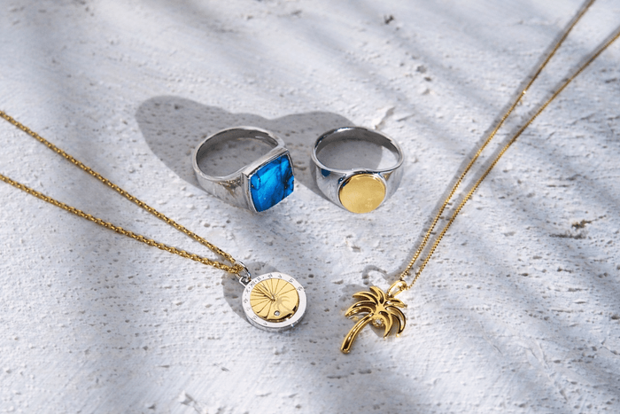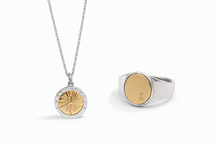 写真右上より時計回りに ChapterⅠ- K18YG×SV925/パームツリーシグネットリング ¥199,650円、K10YG×ホワイトトパーズ/パームツリーペンダント ¥99,550円、SV925×K18YGコーティング/サンダイヤルパームツリーペンダント ¥99,550円、ChapterⅡ- ターコイズ/SV925×ロジウムコーティング/パームツリーシグネットリング(価格未定、7月2日発売予定)(すべて税込・予価)