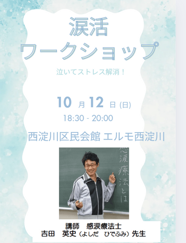 通称「なみだ先生」として、企業・自治体・教育機関・医療機関・福祉施設向けの「涙活」講演などを手がけている、感涙療法士の吉田英史は、2025年10月12日(日)に大阪市の西淀川区民会館で「涙活(るいかつ)」ワークショップを実施します。涙の効能やストレス解消法の講義、泣ける映像の視聴を通じて、参加者に涙活を体験してもらい、泣きやすい体質づくりを目指します。