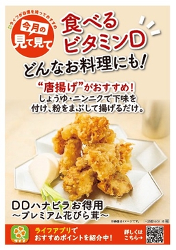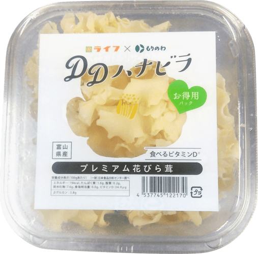 “おいしい” “ワクワク” “ハッピー” をお届けするライフコーポレーションは、「食べるビタミンDⓇ」として商標登録され、ビタミンDを豊富に含むハナビラタケ『DDハナビラ』をライフ限定の大容量サイズで販売しております。