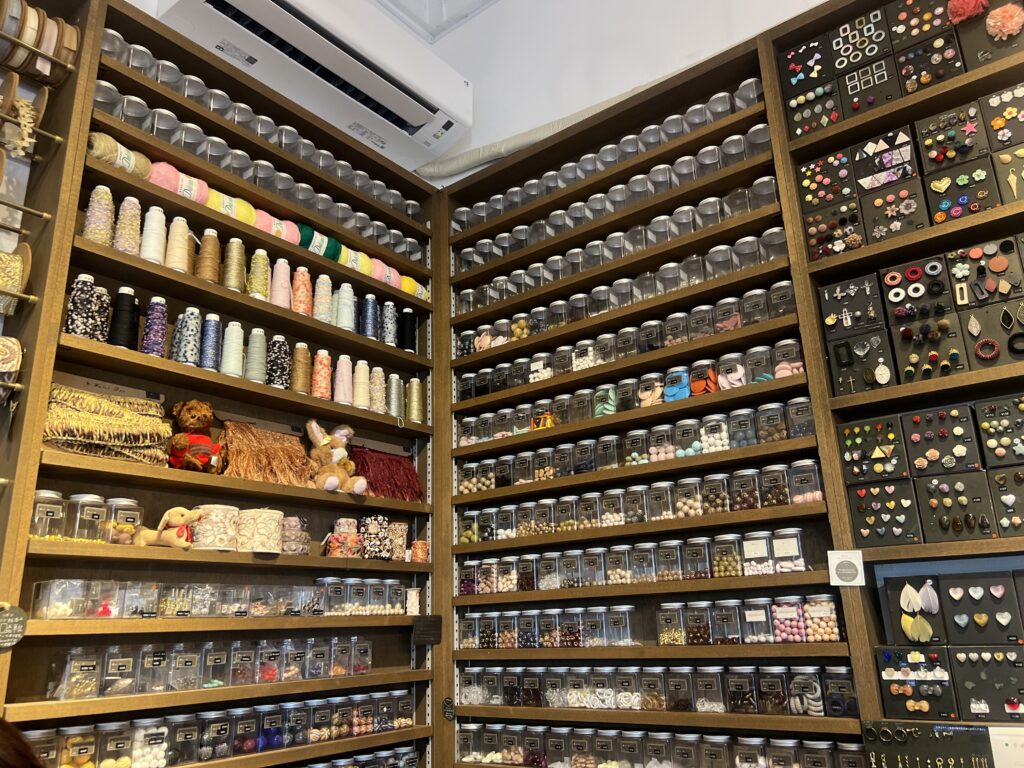 世界中から集めたヴィンテージボタンや極彩色のリボン、キラリと輝くチャームなど、アクセサリー作りが好きな方には堪らない素材が壁一面に並ぶDua osaka!💞