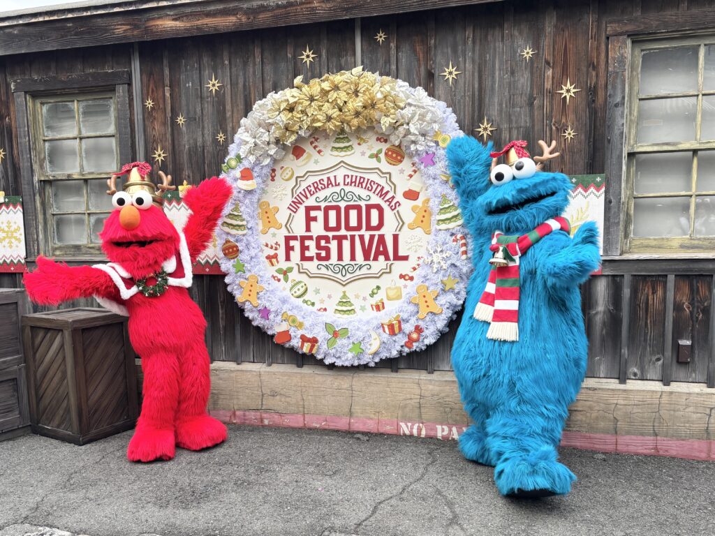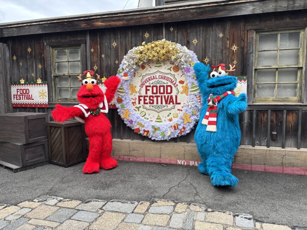 クリスマスマーケットでは、クリスマスカラーのマフラーを付けたエルモとクッキーモンスターが。❤