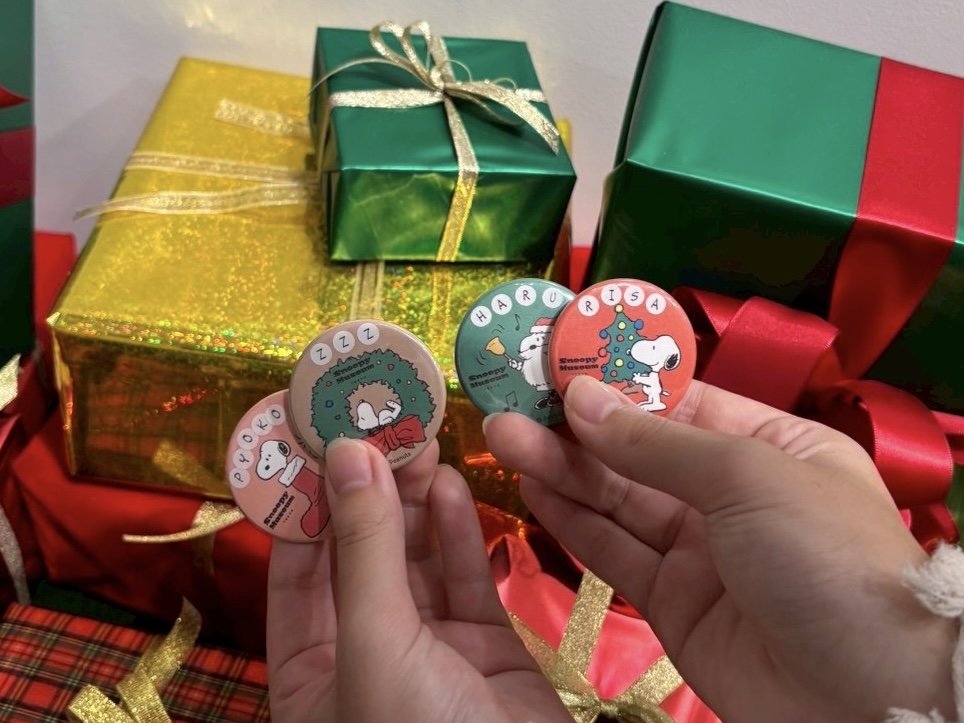来場者ノベルティのステッカーや、自分で作れる「スヌーピー缶バッジ」もクリスマスデザインに!🎅🎄