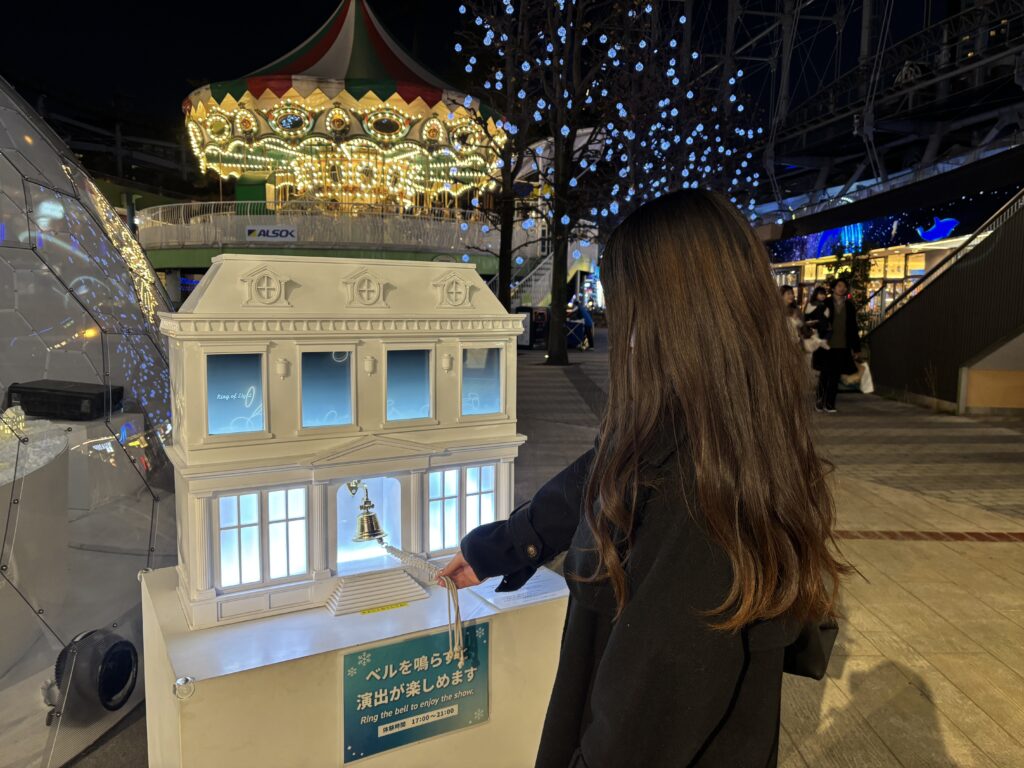 ドームの横に設置されたベルを鳴らすと、スノードームが光り出し、中の街並みが冬の景色に変化するんです!